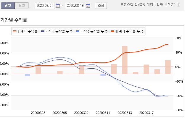 위 저의 계좌를 보시면 지수는 내리꽂고 있는데 계좌 수익률은 그 반대 방향으로 우상향하고 있습니다.